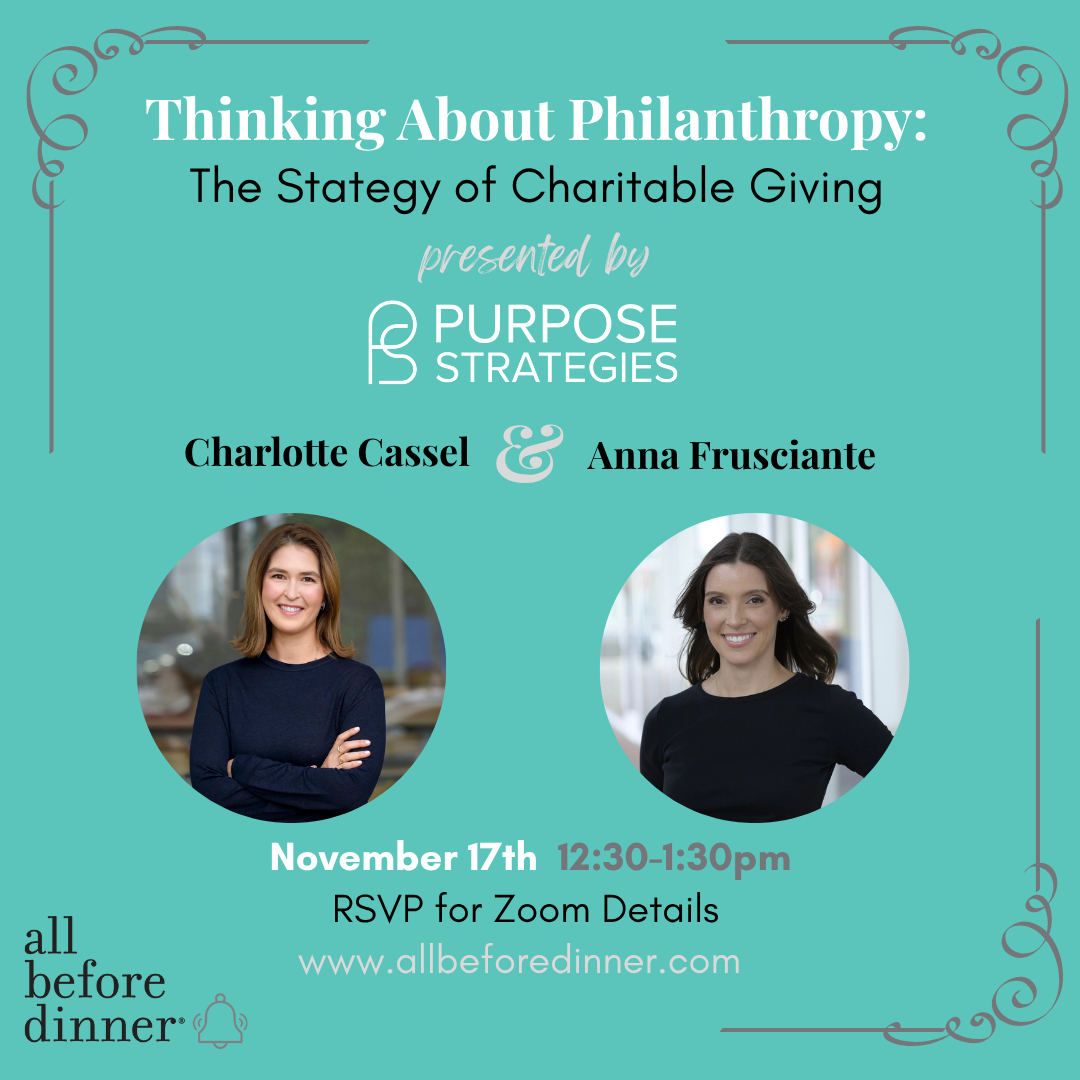 Join Charlotte Cassel and Anna Frusciante of Purpose Strategies for a strategic conversation about charitable donations. RSVP for Zoom link.